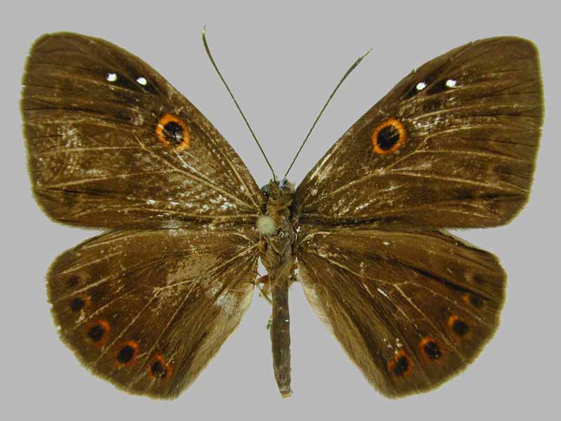 - B - medium sized 44/54 mm, upperside dark brown, weak markings, on the HWUND a more rounded discal line, and never an additional spot near the anal margin.