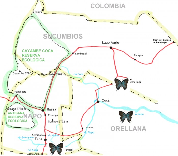 females Atlides polybe pictured near Coca by Liam Lai and at Tiputini by Gustavo Barahona ; the INABIO specimen has been collected at Misahualli.